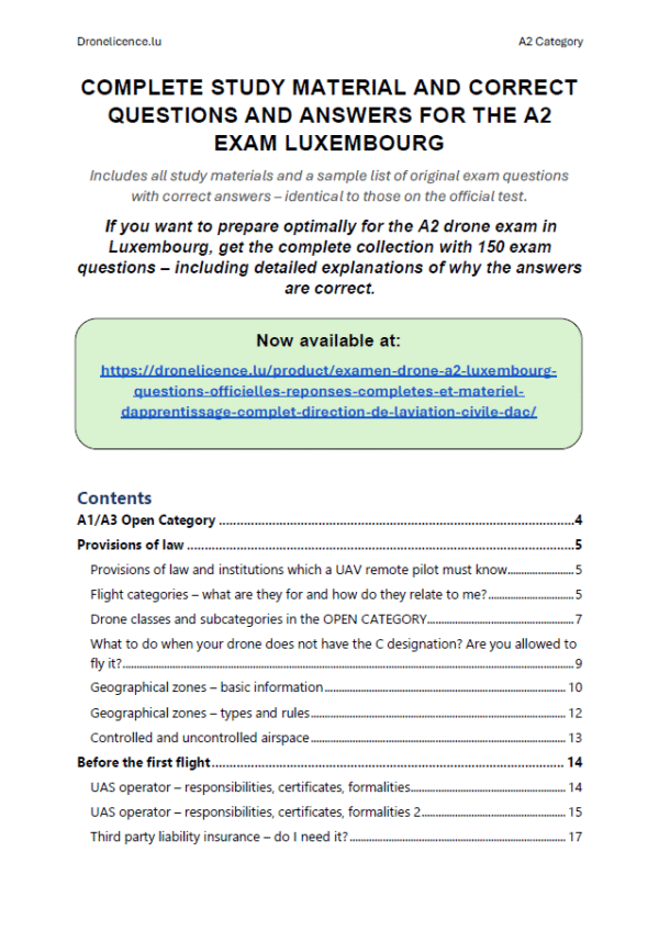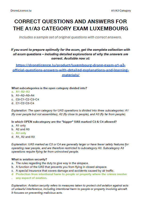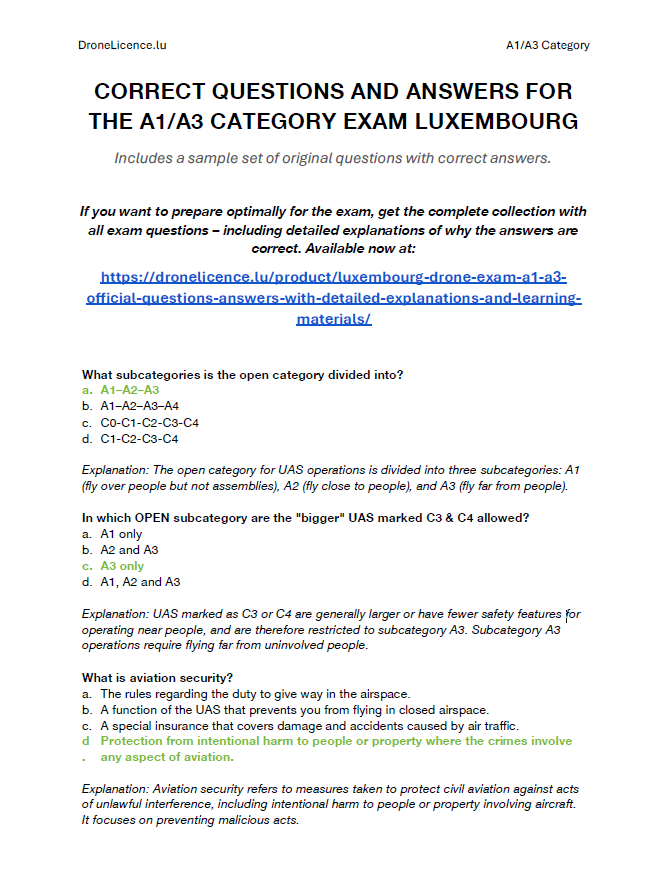 Correct answers and official training materials For Luxembourg Civil Aviation Authority (DAC) drone exam – categories A1/A3 and A2!